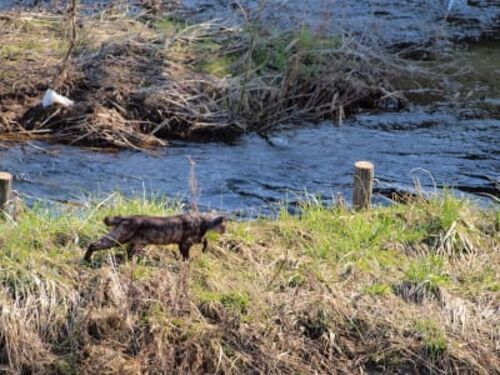 以前ネコが崖上りし、先日は増水して水没していた河川敷。その後水位は戻り、きれいな流れに戻っていた。草の新芽も伸びている。 その中州に、崖上りしていたのとは別のネコがいた。サビネコっていうのか、黒に茶色のグラデーションの入った毛色。しっぽは短…