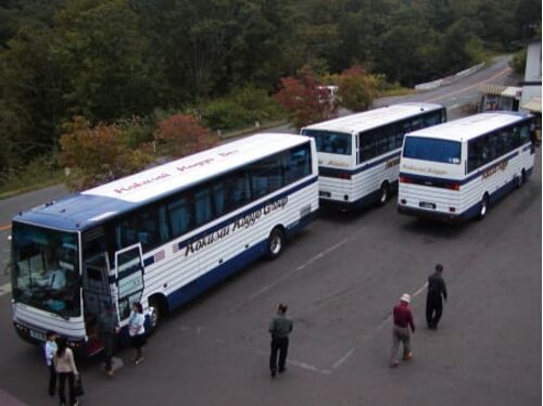 冒頭の写真は、4年ほど前、十和田湖の駐車場で撮影したもの。 観光バスが3台仲良く並んで駐まっている。 3台とも同じ型で塗装も同じなので同じ会社の3台のツアーかと思いきや、それぞれ別のツアーで、しかも3台とも別会社のバス。 手前を向いてお客が降りて…