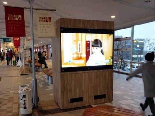 以前の記事の続報2つ。 先週辺りから映像が放映されるようになった、秋田駅西口ぽぽろーどの大型ディスプレイ。 この週末に見ると… CMでは小さめながら音も流れる ディスプレイの外見が変わった!? 板張り! ディスプレイの画面以外のボディ部が、細長い木…