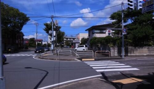 秋田市保戸野原の町、秋大附中東側の道路が狭くてボトルネックだったのが拡幅されて拡げられた辺り、かつて交差点の横断歩道が移設された角=秋田たばこ会館があった角の向かいの変化。 ※たばこ会館の跡には、新しい建物が建ち理髪店が(よそから移って)で…