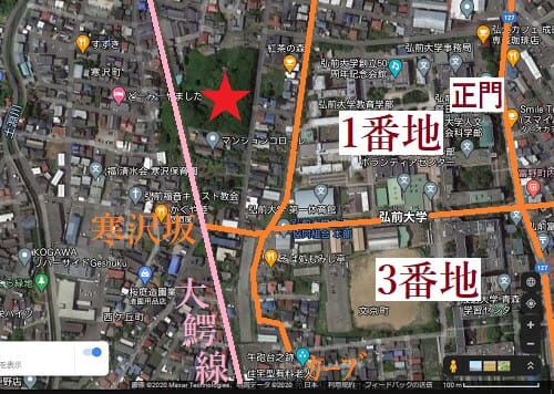 弘前シリーズ。引き続き、弘前大学文京町地区周辺。 気になっていたことその2は、ネットで知ったことの現地確認。 場所の説明(下の航空写真も参照ください)。文京町地区のキャンパスは、正門のある東辺が、富田大通りこと青森県道127号線に面する。 裏の西…