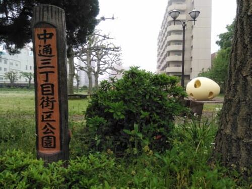 秋田駅からほど近い、オフィス街の中に住宅【19日補足・高層マンションも多い】が混在するような所に「中通三丁目街区公園」がある。 擬木標柱はヘンな位置に設置 2013年の記事でも取り上げたように、この公園にはよく知られた通称・愛称がある。 公園の中の…