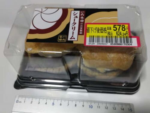 イオン東北各店の愛媛フェアの続き。 まずは、前回少し触れた、フェア終了後購入した、売れ残りの見切り品。 一六本舗の自家製餡シュークリーム 1個95g 295kcal 2個入り645.84円→624.24円。 一六タルトの製造元として、もちろん知っていたけれど、こういう洋…