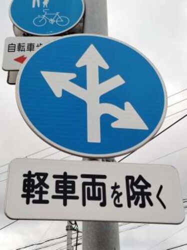 青地に白で矢印が描かれた、円形の「指定方向外進行禁止」の道路標識。 矢印は、上向き一直線と左右向き、またはそれらの組み合わせが一般的だが、道路や交差点の形状が複雑な場合は、それに合わせた特注の矢印になることがある。無数のバリエーションがあっ…