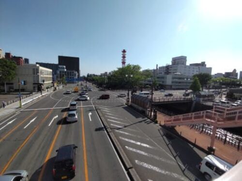 秋田市中央部、土手長町歩道橋から、南方向・二丁目橋交差点を眺める。 旭川対岸の大町三丁目2番地へズーム。 永らく「交通公社前」で、2018年にやっと「川反入口」に改称された【2018年9月29日の記事】バス停の、下り側が前にある、3階建てのビル。※色が似…