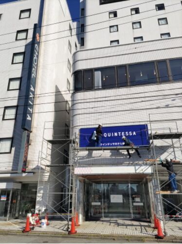 2025年9月30日。秋田市大町二丁目のホテルの玄関で、足場を組んで工事をしていた。 この建物は、百貨店・本金(ほんきん。移転して、現在は西武秋田店)跡地に、1987年に秋田ワシントンホテルとしてオープンしたもの。2007年にイーホテル秋田となり、新型コ…