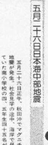 秋田県民(と津軽地方など隣接県日本海側住民)にとって5月26日は、9月1日と3月11日と並んで忘れてはならない日である。 1983年5月26日11時59分57秒にマグニチュード7.7の「日本海中部地震」が発生。津波により各地で合わせて100名が亡くなった(津波以外の…