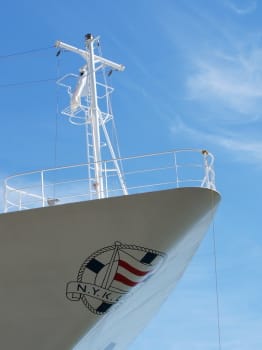船首には日本郵船の英名「NIPPON YUSEN KAISHA」の略、「NYK LINE」のマークがある。
