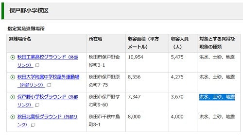 避難場所と避難所については、秋田市役所防災安全対策課のホームページに、地区ごとに一覧が掲載されている。