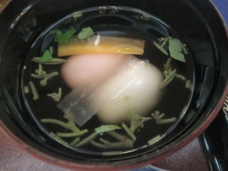鹿角や青森では、そうめんや春雨を入れるものも見られる。ホテル鹿角では、ミツバとジュンサイが入っていた。秋田県内ながら沿岸部名産であるジュンサイは、ホテルによるアレンジだと思うが、すまし汁に合う食材だから、好適。