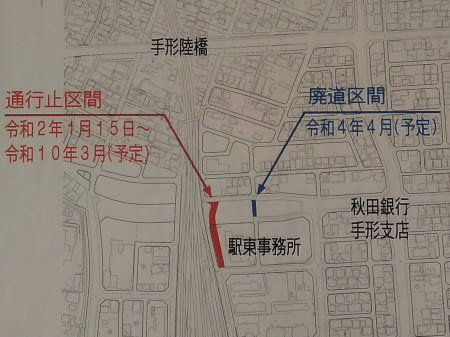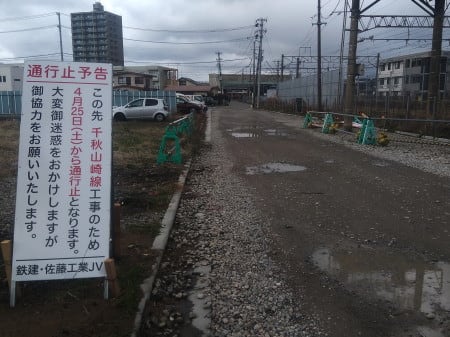 秋田市のサイトにも情報が見当たらず、この看板だけでしか知ることができないようで、詳細は分からないが、今週末4月25日から、アンダーパス予定地の上に当たる部分が通り抜けられなくなるようだ。