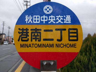 羽後交通のバス停では、かつては隷書みたいな味のある文字、その後も、楷書系の毛筆体で名称が表示される。単に古臭いのではなく、最近は、ローマ字読みでなく意味の英字表示や、営業所の電話番号を表示するなど、意欲的でもある。