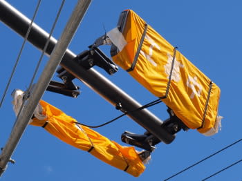 2か所(ローソンの1つ南ともう1つ南=禅林街の入口)では信号機も更新されるところで、新しい茶色の信号機がカバーをかぶってスタンバイしていた。