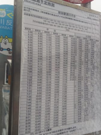 ちなみに、特別ダイヤは、ほぼすべての路線が20時頃で終わってしまう中、上りの牛島経由の仁井田御所野線だけはとりわけ遅くまで走り、イオンモール秋田20時00分→西口20:32(→長崎屋車庫)、イオンモール秋田21時00分→西口21:32(→県庁車庫)が、全方面の特別ダイヤの中で最後から2番目と最終便。それだけの需要があるのか。
