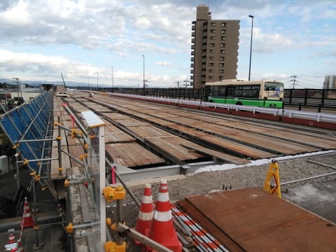 秋田駅の北にある、奥羽本線の東西を結ぶ県道のオーバーパス「手形陸橋」の工事風景でした。※前回は2017年4月