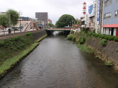 正面奥の特徴的な屋根は「平野政吉美術館」と併設の県立美術館、左は県民会館。間の道(中土橋)を進むと市立中央図書館や公園内へ登る坂がある。
