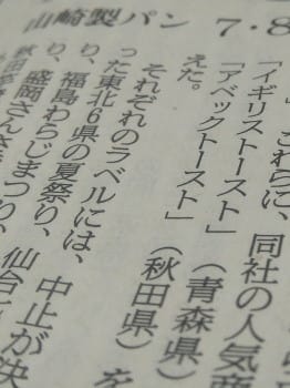 「山崎製パンは(略)パンを発売する。」「同社の人気商品「イギリストースト」(青森県)と「アベックトースト」(秋田県)を加えた。」