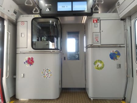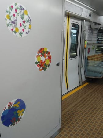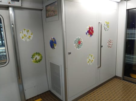 車内の壁には、直径30センチほどの円に、さまざまな花々が描かれ、ランダムに貼られていた。車外同様花の名前がないのが惜しい。