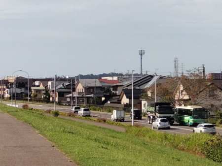 上り運用前、車庫発の回送ダイヤは余裕があり、渋滞がなければ、始発10分近く前に牛島西四丁目に着くようだ。その時間調整は、道路が広い、雄物川堤防下の茨島・大住アンパスの通りで路肩に寄せて行っている。茨島側の堤防から見下ろす