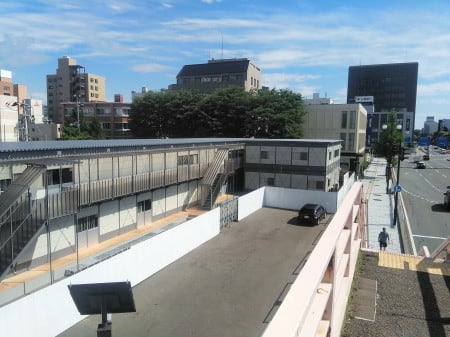 このプレハブは、秋田県民会館跡地に建設中の、県と秋田市の複合新文化施設建設工事の現地事務所とのこと。7月中旬から建設工事が本格化し、完成する2021年12月まで使われ、最盛期には100人超が出入りする。