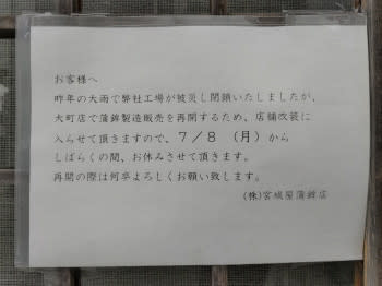 「大町店で蒲鉾製造販売を再開するため、店舗改装に入らせて頂きます」「しばらくの間、お休みさせて頂きます。」「再開の際は何卒よろしくお願い致します。」