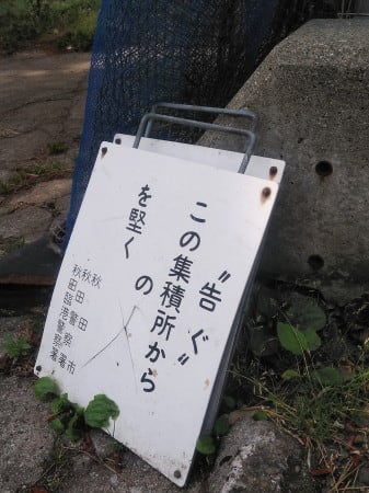 30センチ×24.5センチほどの白い板に、縦書きで「“告ぐ”/この集積所から/ の /を堅く 」「秋田市/秋田警察署/秋田臨港警察署」。