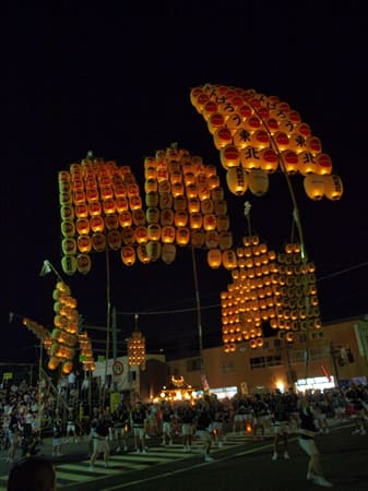 竿燈まつりは、明かりを灯したちょうちんをたくさんつけた「竿燈」(大人用で46個。高さ12メートル、重さ50キロ)をお囃子に合わせて掲げて五穀豊穣を願うとともに、さらには手のひら、肩、額、腰などで支えて、その技を競う。ルーツは青森のねぶたなどと同じく、七夕の疫病除けの行事とされている。
