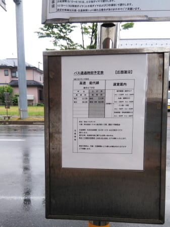 ともかく、広面蓮沼での乗車位置が分かりにくい。バス停は真向かいだが、道路横断は信号まで回らないとならない(交通量が多いので、横断歩道以外の横断は危険で無理)から、バスが見えてからでは間に合わない。あと、表示板に「秋北バス」と書いていないのも、戸惑う客はいるかもしれない。