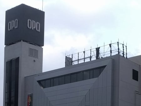 AEONの表示がなくなっており、その跡と左右にかけて、足場か仮の囲いのようなものが組まれていた。