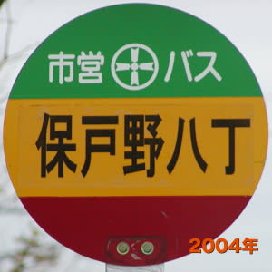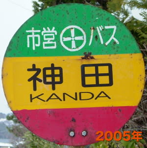 3は、僕の記録と記憶があいまいで申し訳ないが、上の1と同じものを同じ年に撮影したものだと思う。写真では分かりにくいが、黒文字のバス停名部分は、透明シールに印刷して貼っている。フォントもパソコンの丸ゴシック体と思われ、経費節減しているのが伺える。でも現在も現役のものが多いようで、耐久性はあるようだ。