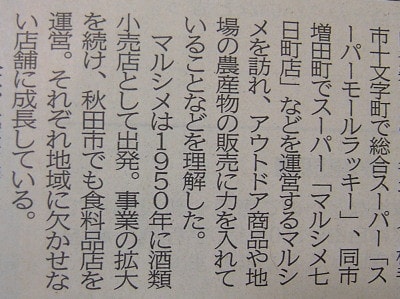 今回の新聞によれば「横手市十文字町で総合スーパー「スーパーモールラッキー」、同市増田町でスーパー「マルシメ七日町店」などを運営するマルシメ」とあった。