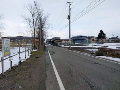 駅から来て、雄物新橋を渡って右折すると、長い坂。車道は広く、川と反対側に歩道付き。坂の下に「雄物新橋」バス停がある。