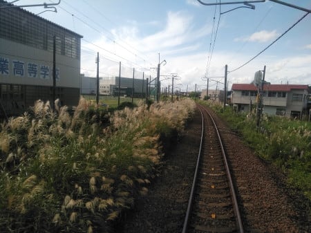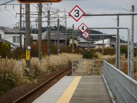 ホーム端のすぐ先、左の電化柱(架線柱)に黄色い縦長のもの、盛りのススキで隠れるが、その手前の線路際の地面に、白いもの。