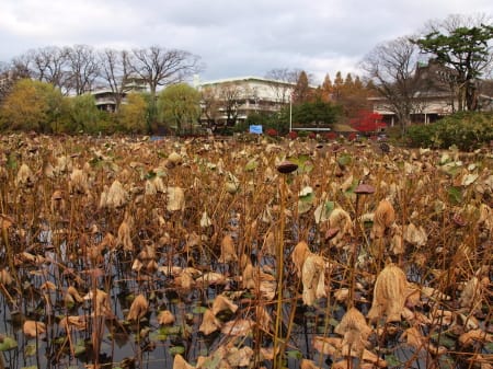 片付いて水面がきれいに見えるお堀はすっきりしていいものだが、今しか見られない枯れたハスが茂るお堀も、晩秋・初冬らしい独特の雰囲気があって捨てがたい。