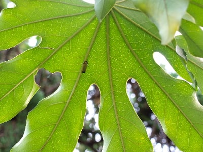 その後、草刈りをして環境が変わったこともあり、我が家のバナナ虫たちの多くは、ヤツデの葉に移住した。ところが寒くなってくると、ヤツデの葉の裏にびっしりいたはずのバナナ虫の数は減ってまばらになっていた。
