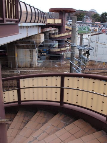 2年間通れなかった北側の歩道には、南側歩道にはない特徴的なものがあった。中央部・線路際両側に1つずつある、らせん階段である。(西端には、南北とも普通の階段はある。)