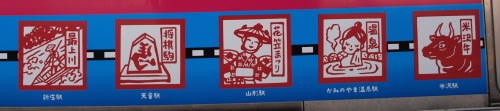 沿線の駅にちなむ風物・名物などをスタンプ風(というか版画風?)に描いたものが、ピンク帯の下の水色帯上に青森から福島まで順に並んでいる。(向きは列車の青森方向・福島方向と対応している)