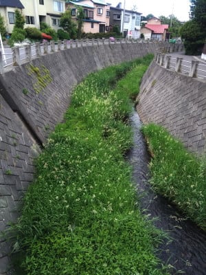 弘前大学文京町地区裏手の土淵川では、ここ20年近くかけて、地元の住民が1人で、川の中にキショウブを植えている。