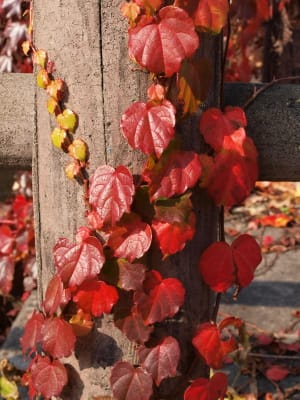 その階段の擬木の手すりなどにツタが絡まり、紅葉しているのだ。