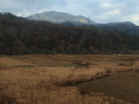 線路周辺は雪がないが、高い山にうっすらと雪が。