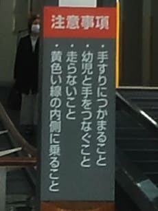 東向きにはこの1枚だけ。動く歩道に乗り口手前の柱に設置されている。乗る前に見るべき注意事項だが、手前すぎる感じもする。
