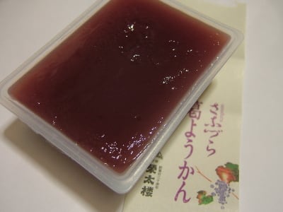 【4日追記】原材料欄によれば「蓮粉、蕨粉、加工澱粉」とあり、これらが固めるのに関わっていそう。一般的なくず餅もそうであるように、葛は使っていない。他にグラニュー糖の次の2番目に「いんげん」が出るのがおもしろい。3番目の「葡萄液(山はつかない)」、最後の「酒石酸(ブドウの酸味成分の1つ)」辺りが、ブドウ味を作り出しているようだ。元祖と違って、他の果実は使われていない。