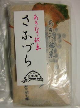 個包装とビニール袋で文字が違い、ビニール袋のシールは「あきた“の”銘菓」となっている。