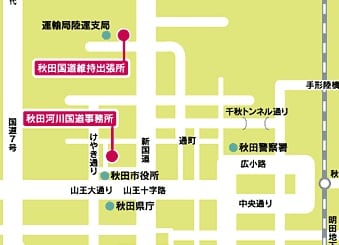 次は、国土交通省東北地方整備局の「秋田河川国道事務所」の略地図。事務所自体は秋田市役所の裏にあるが、他に秋田市内に2つの拠点を構える。