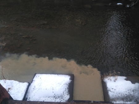 排水口にはゲートがあるようだが、閉じているように見える。けど濁り水が続々出てくる。ここより上流側は当然澄んだ水。