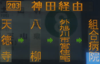 縦書き4つの途中バス停が、左から右に向かって表示されるのは変わらない。(この「オージ」社製の表示機は、矢印を逆向きに表示することも可能)