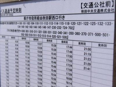 「秋田駅前行き=100・101・102・104…」と延々と表示している。その下には「その他各地行き=300・301…」とあるが、これは「秋田駅へ行かない」のではなく「秋田駅を経由してよそが終点(大学病院、太平など)」の番号だ。ちょっと紛らわしいかも。