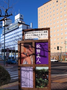 「秋田市まちなかデザイン事業(正式には秋田市まちなかデザイン調査事業?)」とは、秋田市観光物産課が「秋田県緊急雇用創出臨時対策基金」を活用して行う事業で、「観光地としての魅力アップと雰囲気づくり、街のにぎわいの演出などをはかるため、街を彩る装飾などのデザインを検討するとともに、掲出場所の調査等を行う。」のが目的。実際の業務は民間に委託しているようだ。