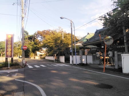 山門前が丁字路交差点で、北(写真左)から同じくらいの幅の道がぶつかる。一方通行はここで終わり、他の2方向は対面通行。